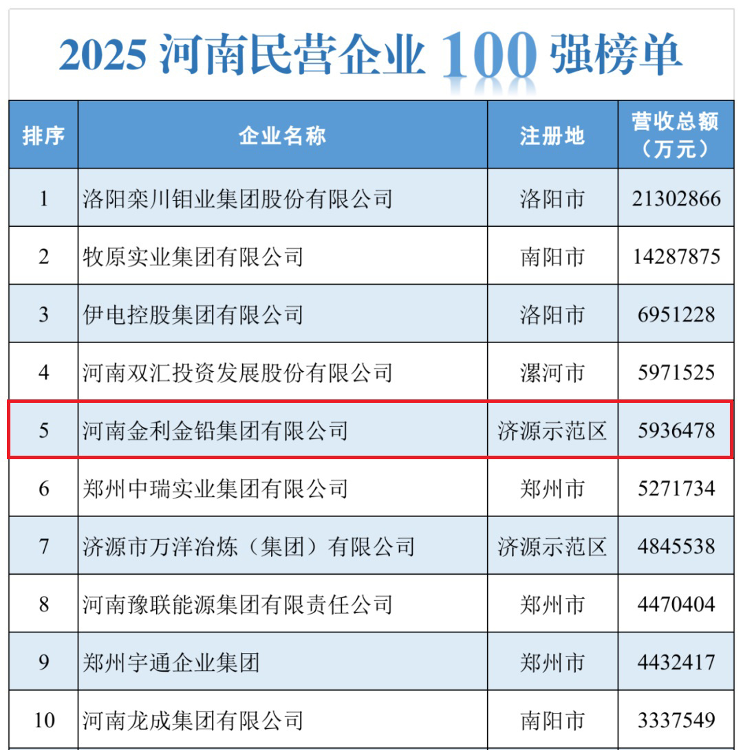 日前,河南省工商联发布2025河南民营企业100强榜单,金利集团以593亿的营收总额位列榜单第5位。